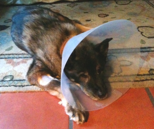 As our adventure continues on Day Three*, the challenge also continues in encouraging her to increase her own strength and motivate her to get up and walk on her own. We had been using a towel–as we had researched- to act as a balancer once she is up on three legs. But Pebbles has a lovely quality of stubbornness, and no matter how much she has to “go”, she has not wanted to get up or accept any assistance from us whatsoever. She would cry and whine while making motions of trying to getting up, but when we would try to help her up, she would flop over on her back and side and become dead weight. This went on for some time, exhausting all 3 of us (and unnerving Pebbles’ brother Monty). Somehow we eventually got her up and outside, carrying her most of the way. Once we put her down in her usual spot, she soon lay down and the whole stubborn-refusal-to-allow-us-to-help act began all over again. The poor thing was so riddled with fear- something that gets in all of our ways when we try to move forward, stopping us in our tracks, no matter how many appendages we have!
